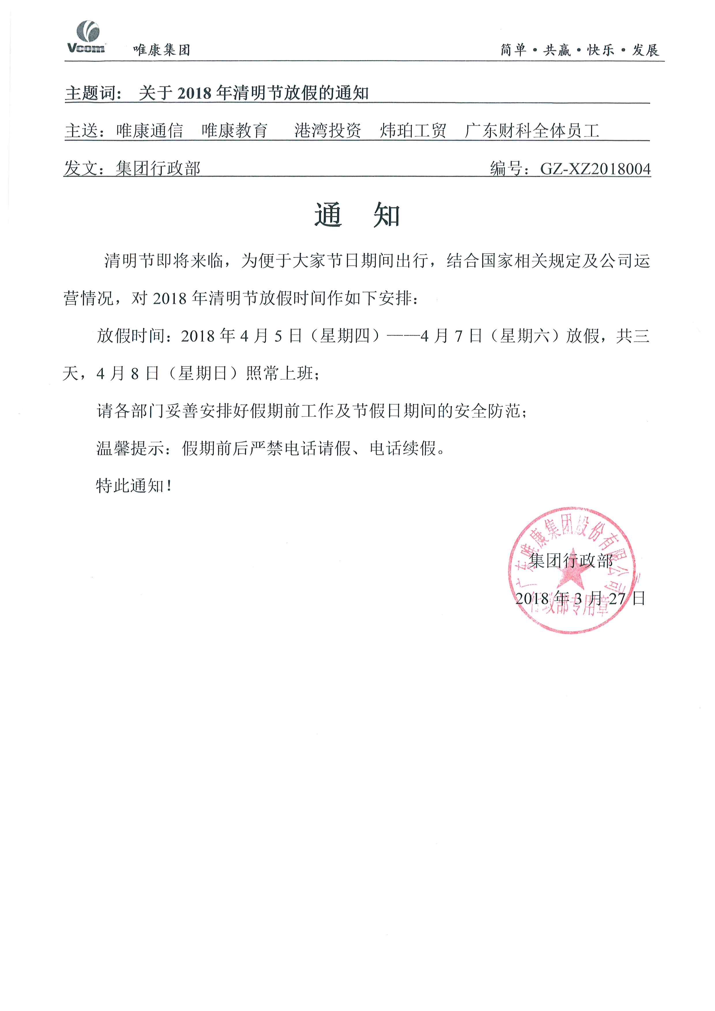 唯康通信2018年清明節放假通知