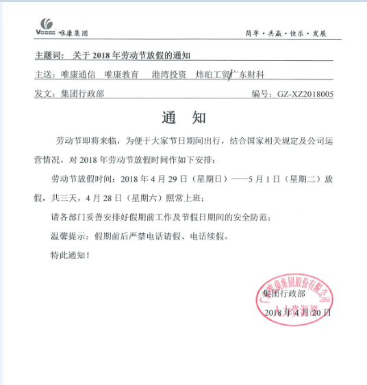 唯康通信2018年五一勞動(dòng)節(jié)放假通知